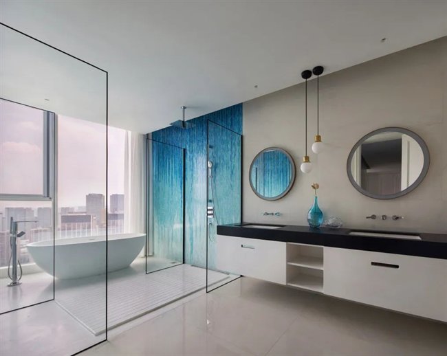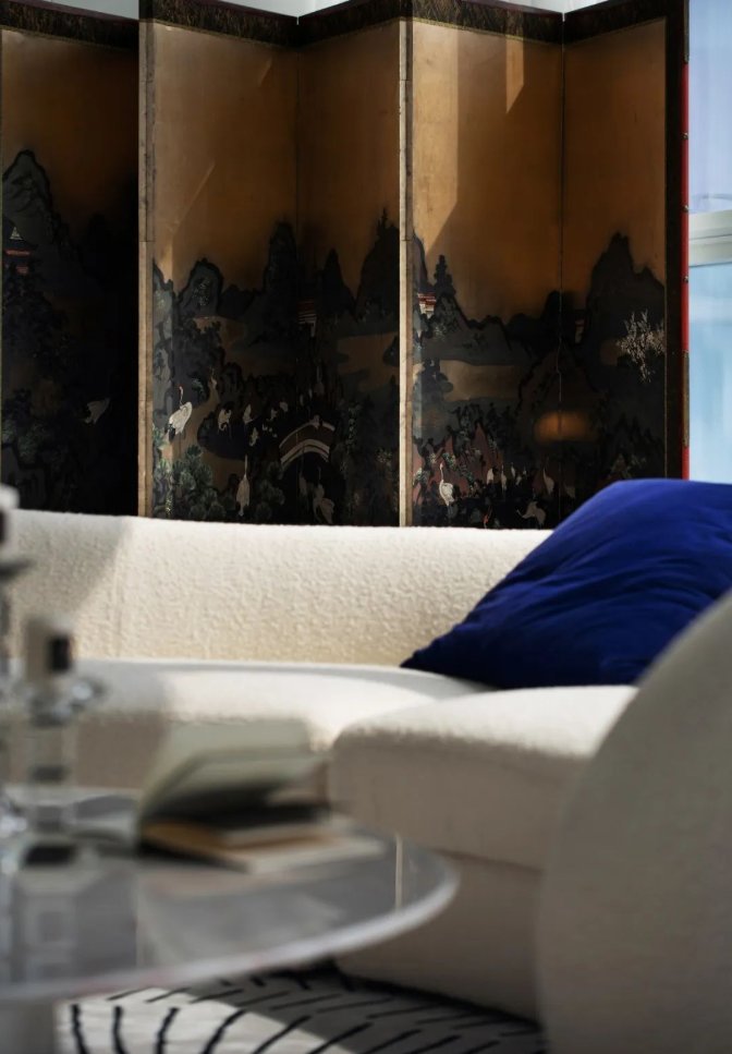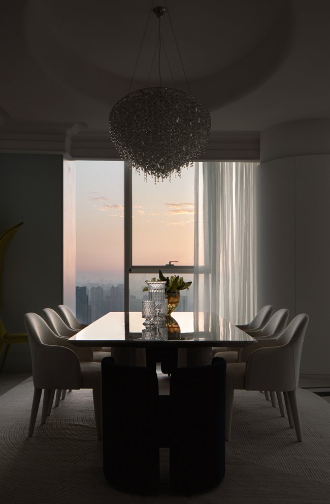 窗是光影的画布,亦成为都市繁华、生活诗意的缩影。设计师保留270°全明落地窗的无限景观视野,欢迎光的漫入、影的舞蹈,让开放式客厅在自然的互动中愈显优雅。