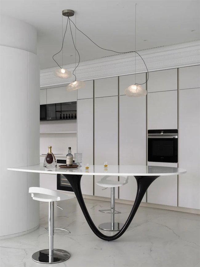 在功能规划上,设计师结合居者一家的饮食习惯,特别规划了开放式西厨岛台与隔绝油烟的中厨。在圆润的弧线解构下,空间中诗意自由流动,同时保持了简净大方的优雅气质。