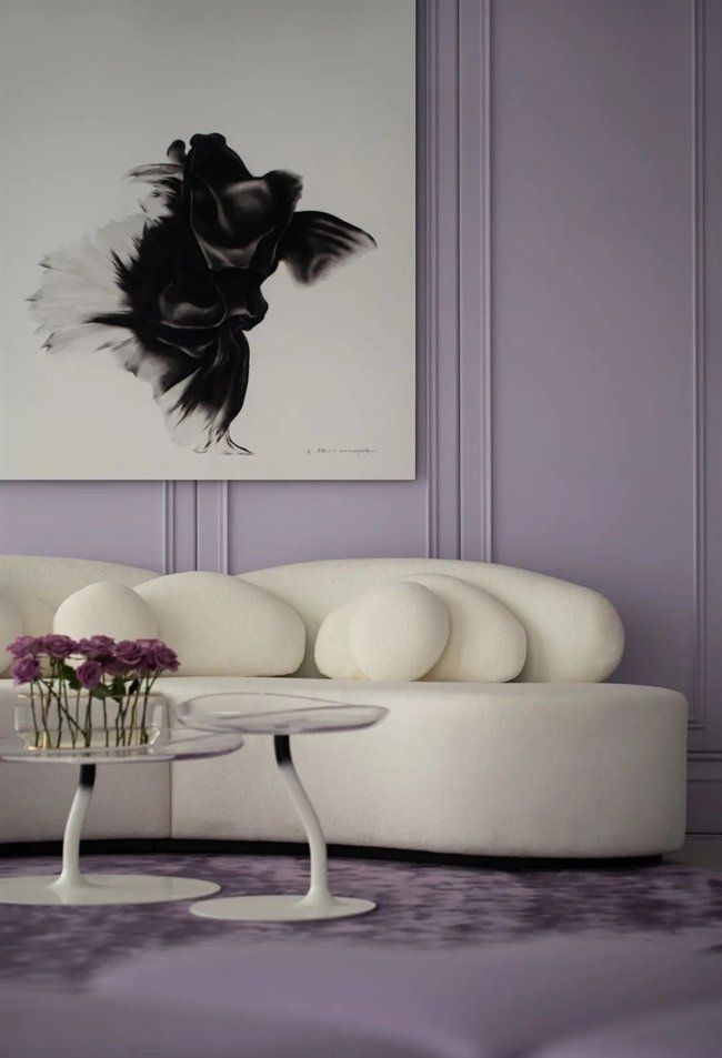 法式雕花嵌于纯白的基底,薰衣草的粉紫调融入空间的肌理,梦幻般的细节丰富了空间的格调,简雅中有隽永韵味。
